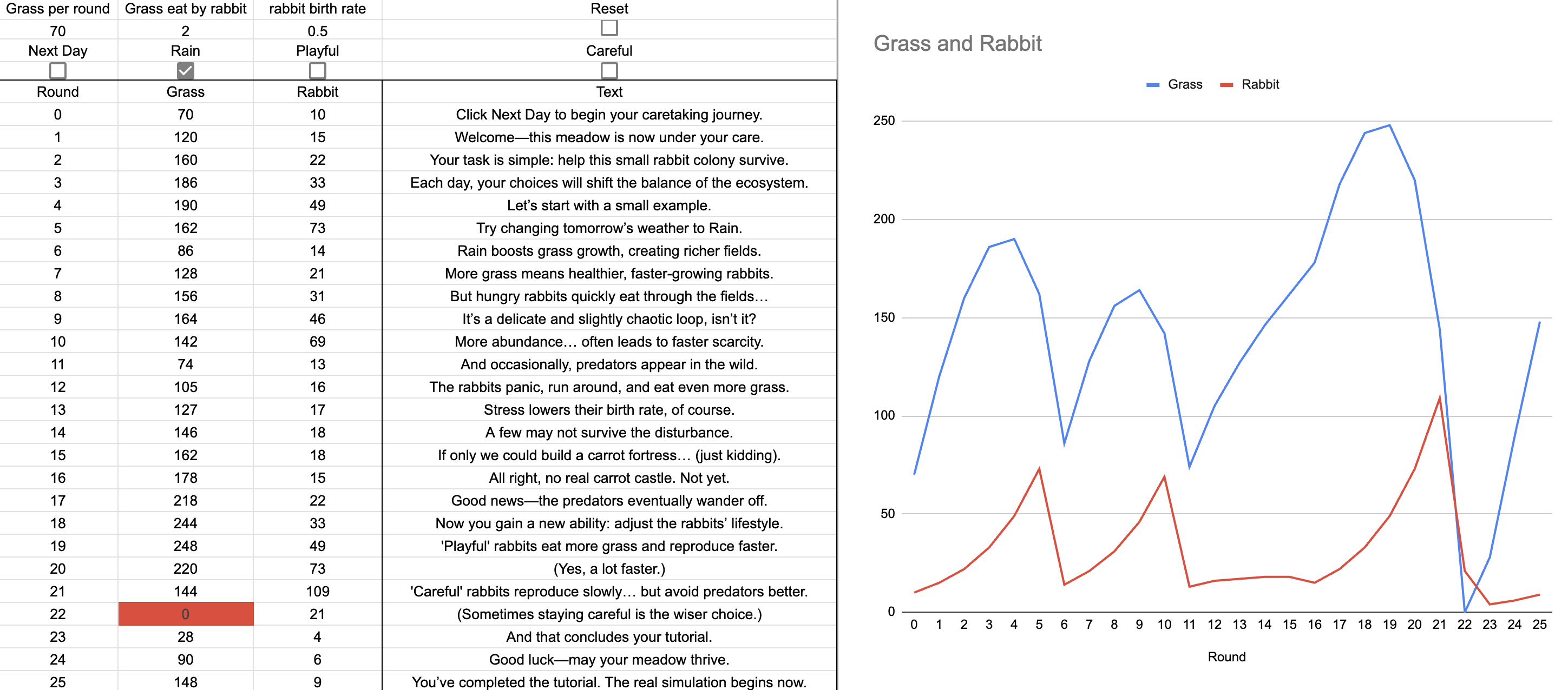 The Rabbit Cycle is a turn-based ecological simulation built entirely inside a spreadsheet.